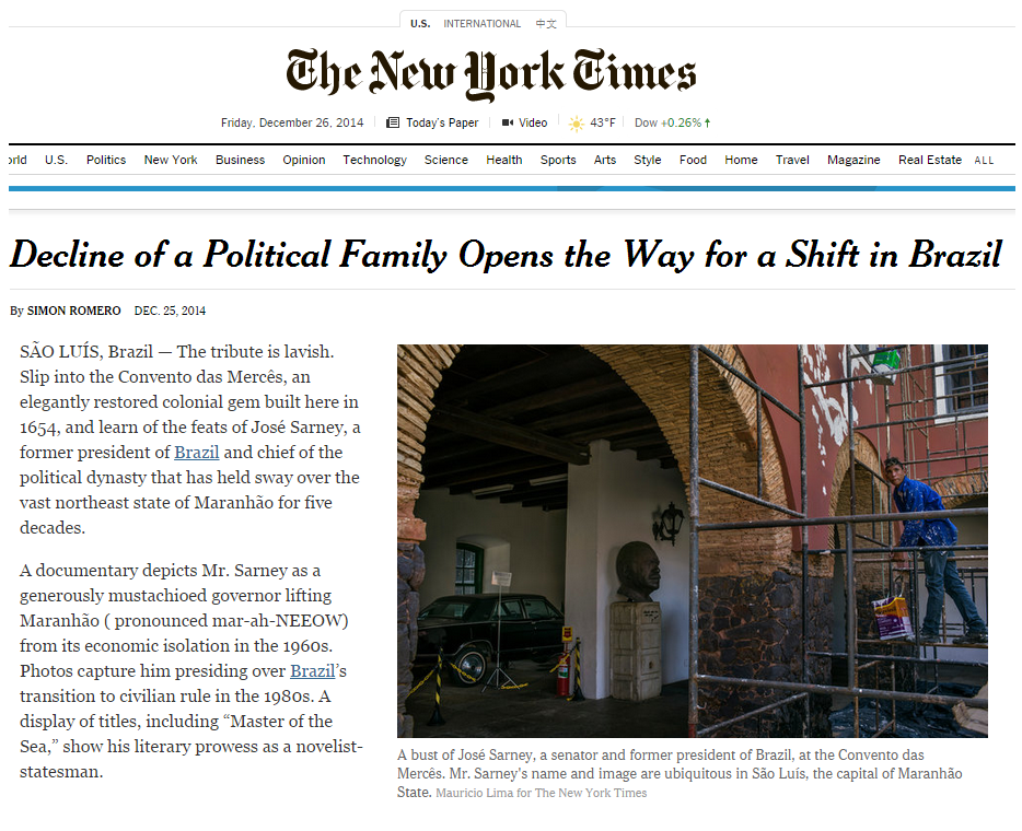 Ainda repercute a derrota da família sarney no Maranhão. Agora internacionalmente, o The New York Times, Jornal americano com maior influência em todo o planeta, trás nessa sexta-feira 26/12, uma matéria que trata o declínio do clá-sarney no Maranhão e consequentemente no Brasil.