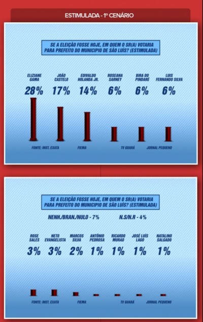 O Instituto Exata ouviu 812 pessoas entre os dias 29 de junho e 1º de julho, para saber quem seria o favorito na disputa pela prefeitura de São Luís. Encomendado pela Fiema, TV Guará e Jornal Pequeno, o questionário mostra Eleiziane Gama como a futura sucessora da capital maranhense nas intenções de voto, João Castelo em segundo lugar, a frente do atual prefeito, Edivaldo Holanda Jr, que ocupa a terceira posição. A margem de erro da pesquisa é de 4 pontos percentuais, com nível de confiabilidade de 95 por cento.